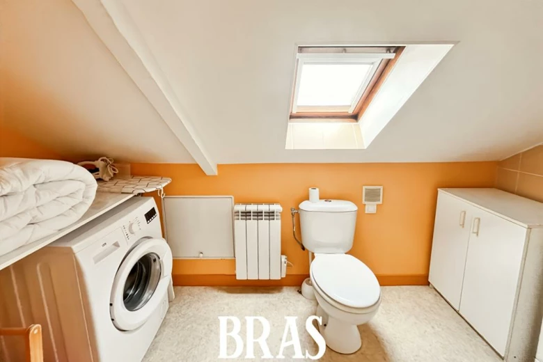 Une entrée de 1.44 m2, une salle d'eau avec wc et espace buanderie (vélux), (1.69 m2 carrez), (3.6 m2 au sol), Un séjour avec placard (8.43 m2 carrez), (10.67 m2 au sol). Une cuisine ouverte (1.91 m2 carrez), (3.21 m2 au sol).