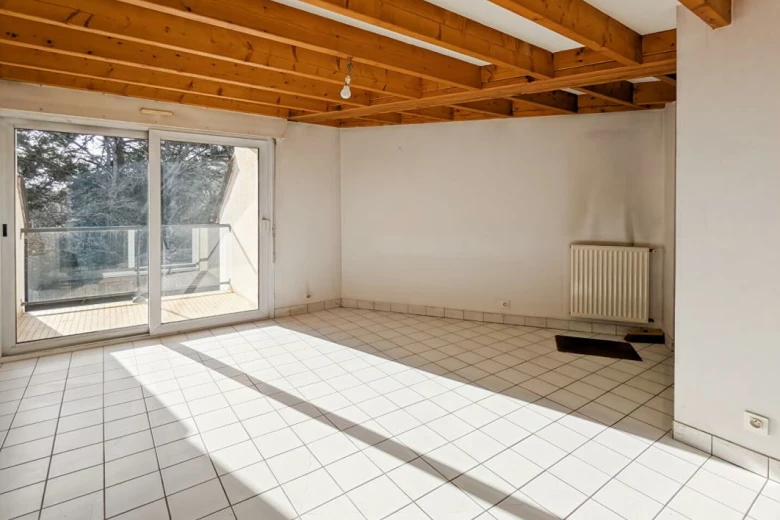 En dernier étage d'une petite copropriété cet appartement a un grand potentiel ! Il comprend un séjour lumineux plein sud donnant sur un balcon ouvert sur la verdure, sans vis-à-vis, un coin cuisine à aménager selon son goût, une petite chambre. L'escalier privatif en bois amène à un palier desservant un placard, une grande chambre de 17m² au sol et une salle de bains.