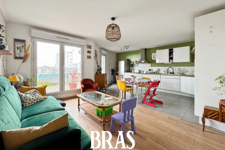 Nous vous proposons à l'achat, ce très bel appartement niché au 5ème étage, avec sa superbe terrasse de 31 m². Ce bien comprend une entrée avec dégagements et placards, un WC/Salle d'eau, une superbe pièce à vivre d'environ 26 m² avec son espace cuisine entièrement aménagé et équipé ! L'espace nuit est composé de 2 chambres dont une avec sa salle de bains personnelle. En complément, une cave en sous-sol et une place de parking privée .
