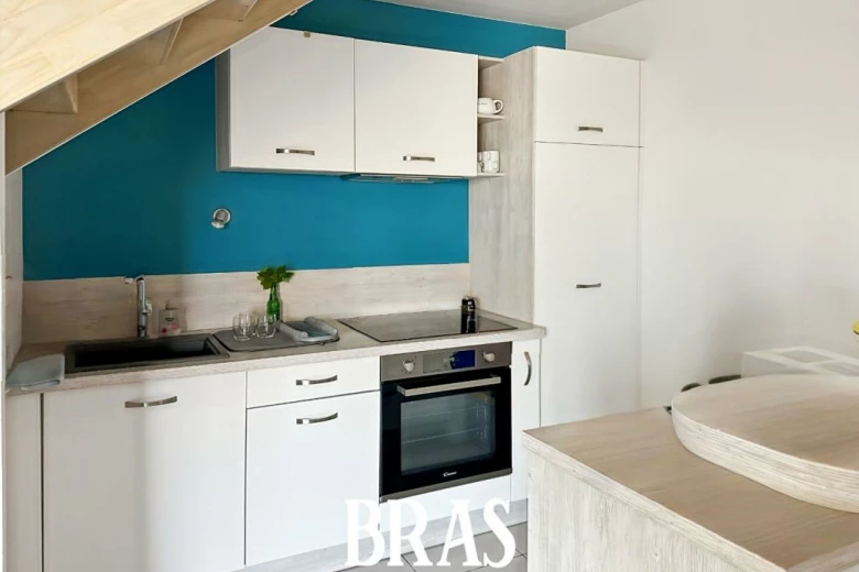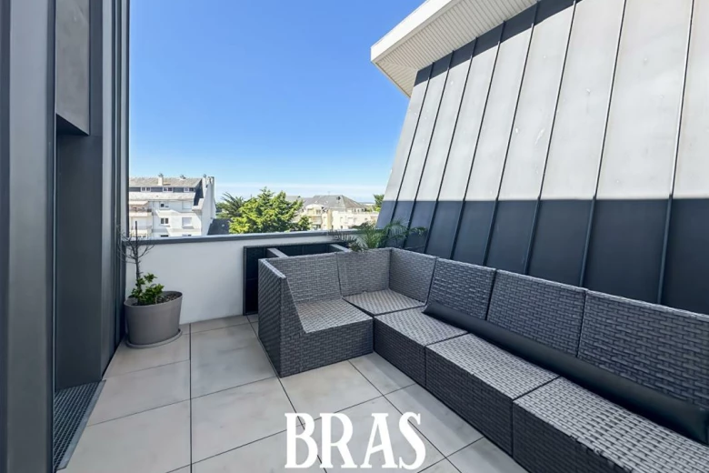 Le Pouliguen proche centre, au dernier étage d'une résidence récente un appartement en duplex comprenant au rez-de-chaussée: une entrée, un salon/séjour donnant sur une terrasse, une cuisine aménagée et équipée, un dégagement desservant une chambre, une salle de bains et un wc.