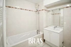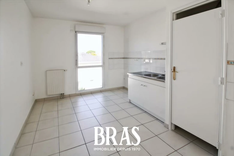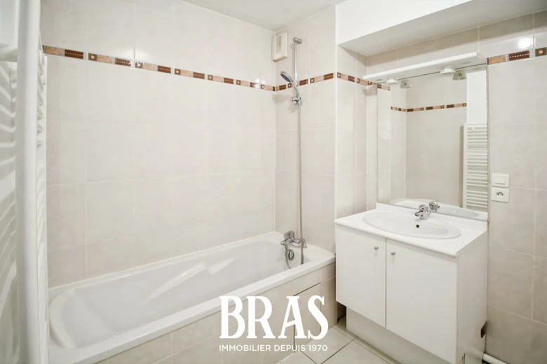 L'appartement dispose d'une entrée avec placards et wc, d'un espace de vie et d'un bureau attenant, donnant sur la terrasse exposée Ouest, d'une cuisine indépendante, de 2 chambres dont 1 avec salle de bains privative, et d'une salle d'eau.