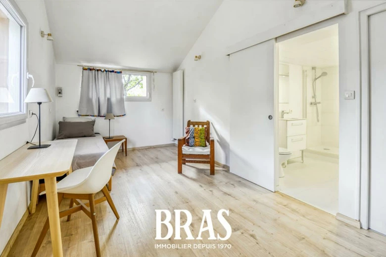 Le + : un studio aménagé au rez-de-chaussée avec son espace d'eau (douche + WC) et son entrée indépendante. Idéal pour un espace de travail indépendant, un espace pour un ado, ou une location ?