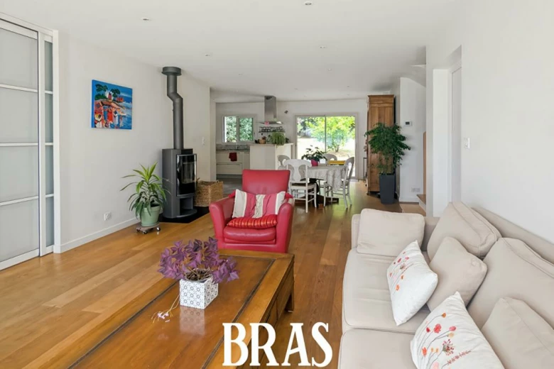 Fonctionnelle et parfaitement entretenue, elle propose au rez-de-chaussée une vie de plain-pied avec une suite parentale une vaste pièce de vie traversante exposée Nord-Sud, baignée de lumière, une buanderie, un garage, le poêle et les matériaux de qualité, comme le parquet massif, apportent une ambiance chaleureuse et élégante.