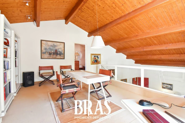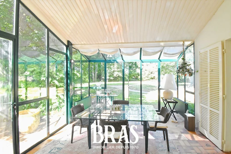Cette première maison conçue par un architecte, d'une superficie d'environ 272m², est composée d'une belle entrée desservant une grande pièce de vie avec toit cathédrale, donnant sur une mezzanine avec balcon, une chambre et sa salle de bains privative avec WC. Une cuisine avec séjour et une belle véranda permettant de profiter du parc, un dégagement desservant 3 autres chambres dont deux avec salles de bains privatives, WC.