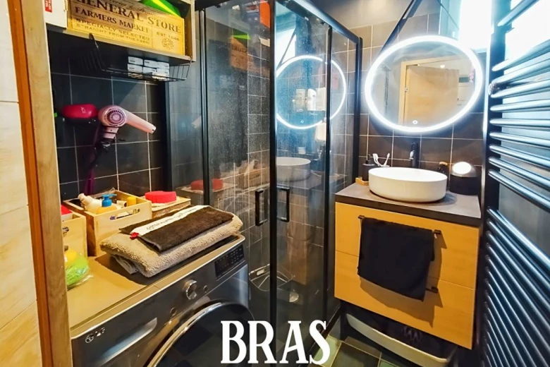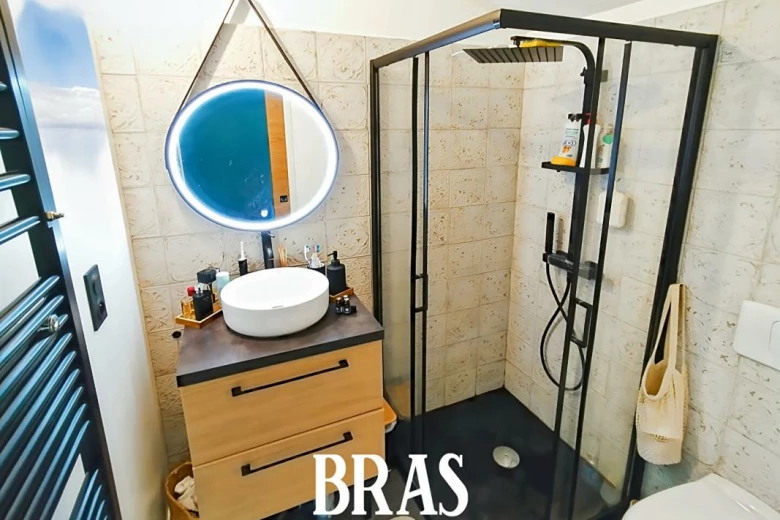 Ce même niveau dispose d'une salle d'eau (douche, meuble vasque et branchement lave-linge) et de WC séparés.