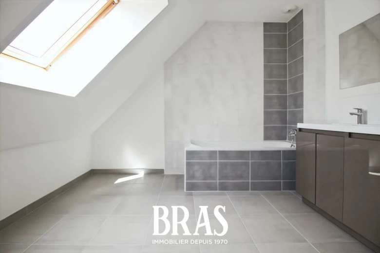 A l'étage, un palier de 10m² pouvant faire office de coin jeux, bureau ou bibliothèque, trois chambres spacieuses, une grande salle de bains.