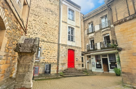 Les façades en pierre, les combles couverts d’ardoises et les balcons en ferronnerie participent à l’identité de cet ensemble architectural. À l’intérieur, un escalier en bois ancien, vestige du bâtiment d’origine du XVIIᵉ siècle, constitue l’un des éléments patrimoniaux les plus remarquables de l’immeuble.