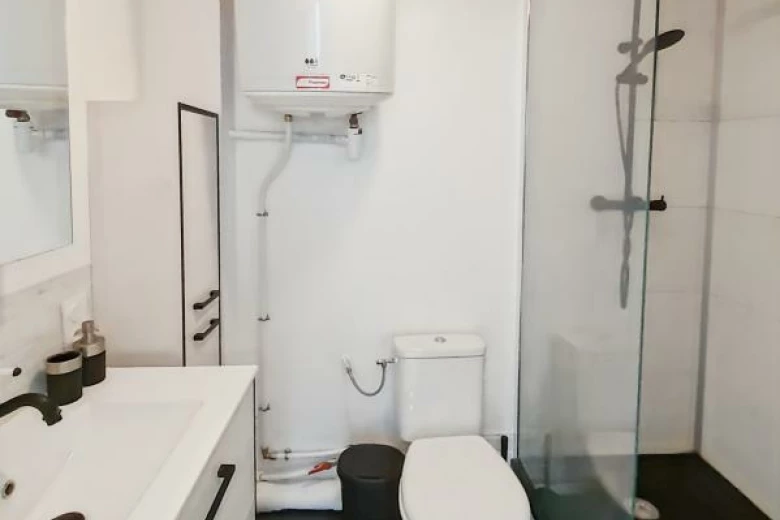 Au premier étage, un studio meublé (16.60m²) avec kitchenette (hotte, plaques, réfrigérateur et micro-onde) et une salle d'eau (douche et meuble vasque) avec WC.
