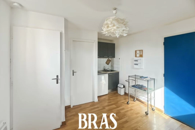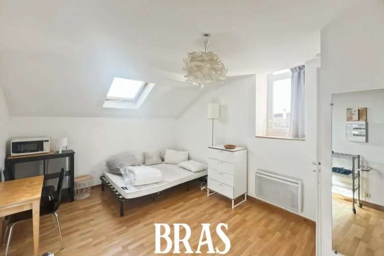 Studio MEUBLÉ de 17,41 m² situé au 3ème étage et dernier sans ascenseur et comprenant : séjour ouvert sur kitchenette aménagée et équipée (plaques de cuisson, hotte et réfrigérateur table top), une salle de bains avec lavabo et WC.