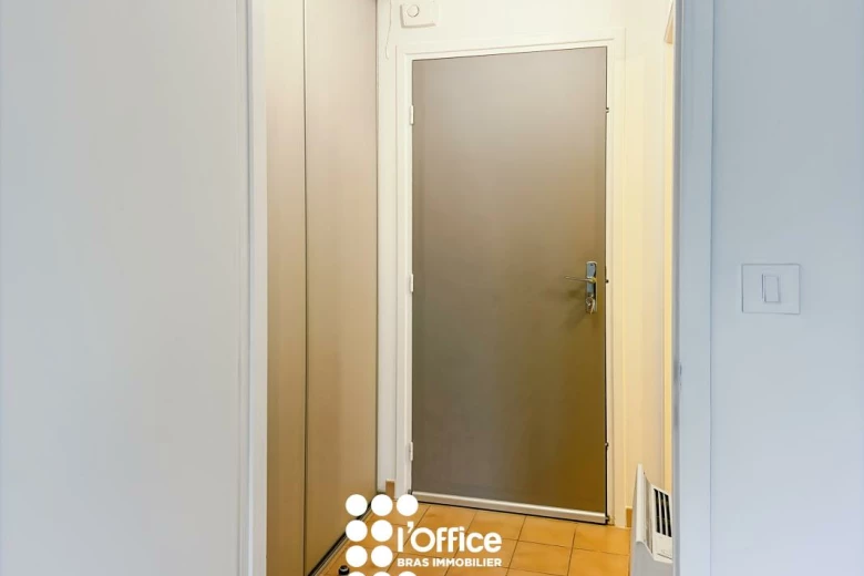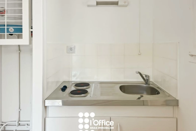 PROCHE PENTAGONE - Studio de 25.88m² situé en rez-de-chaussée arrière d'une petite résidence au calme. Entrée avec grand placard, pièce de vie avec rangements, kitchenette avec 2 feux électriques et un réfrigérateur, salle d'eau avec WC.