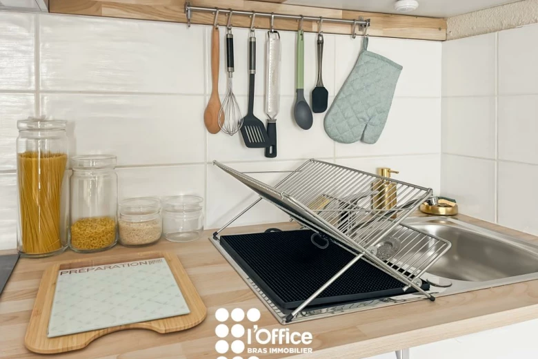 Il se compose d'une pièce de vie lumineuse avec une cuisine aménagée et entièrement équipée (meubles de rangement, évier, plaque à induction 2 feux, réfrigérateur table top, four Moulinex, micro-ondes, hotte, machine à laver), accompagnée de tout le nécessaire de cuisine sélectionné avec soin. Le coin salon - salle à manger s'ouvre sur une belle terrasse privative de 9,90 m².