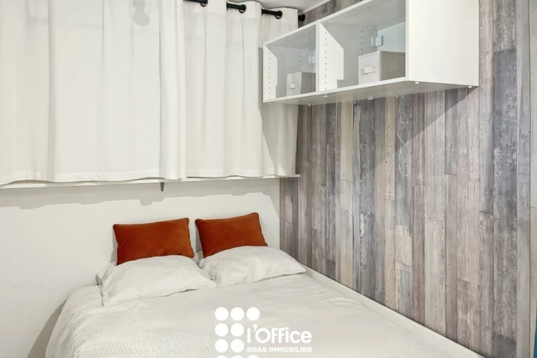 Un espace nuit séparé offrant de nombreux rangements dont un lit de 140x200 avec tiroirs. Vous y trouverez également une salle d'eau fonctionnelle avec rangements, sèche-serviettes électrique et WC.