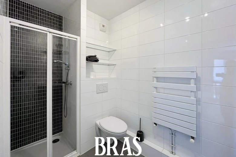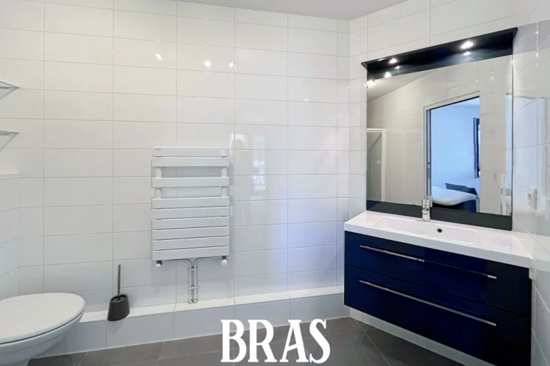 onde), donnant sur une loggia de 4,90m² exposée Sud-Ouest, une salle d'eau avec douche, meuble vasque et WC.