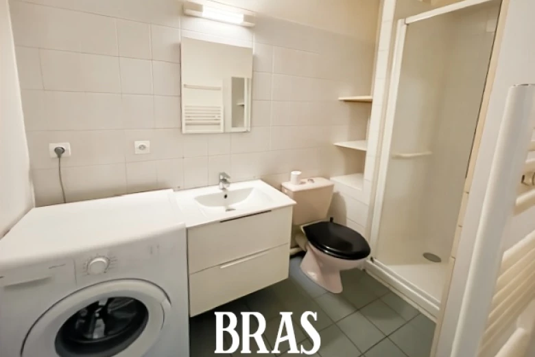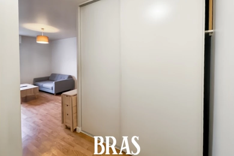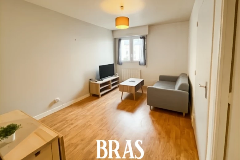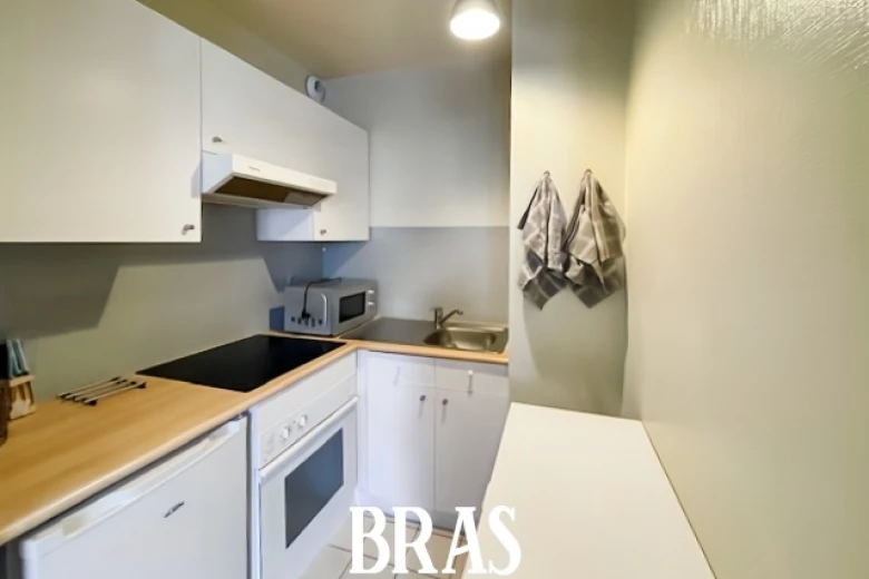Appartement 2 pièces meublé situé au 1er étage avec ascenseur. Comprenant une entrée avec placard, une pièce principale avec coin cuisine aménagée et équipée (hotte, plaques, réfrigérateur), une chambre, salle d'eau (douche) avec WC.