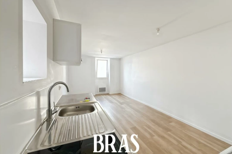 Au coeur du bourg, appartement de type 2 de 34.20m², situé au 1er étage sans ascenseur et comprenant une pièce de vie avec kitchenette aménagée et équipée de plaques cuisson vitrocéramique et d'un réfrigérateur table top), une chambre, salle d'eau avec douche, meuble vasque, emplacement machine à laver et WC séparés.