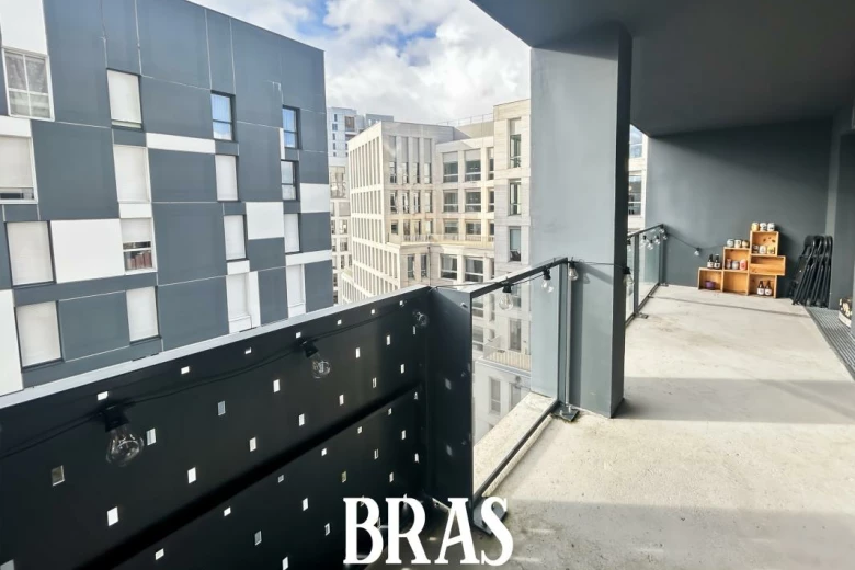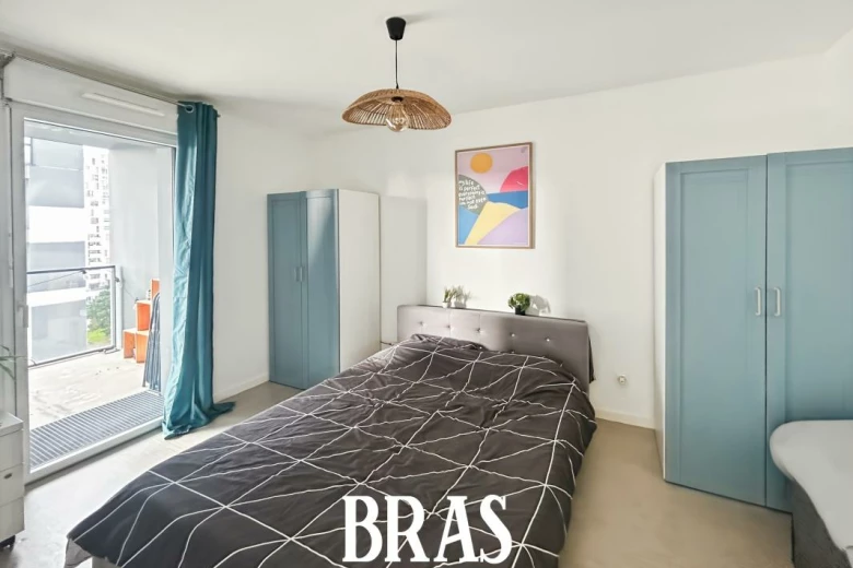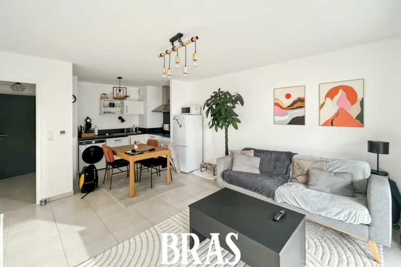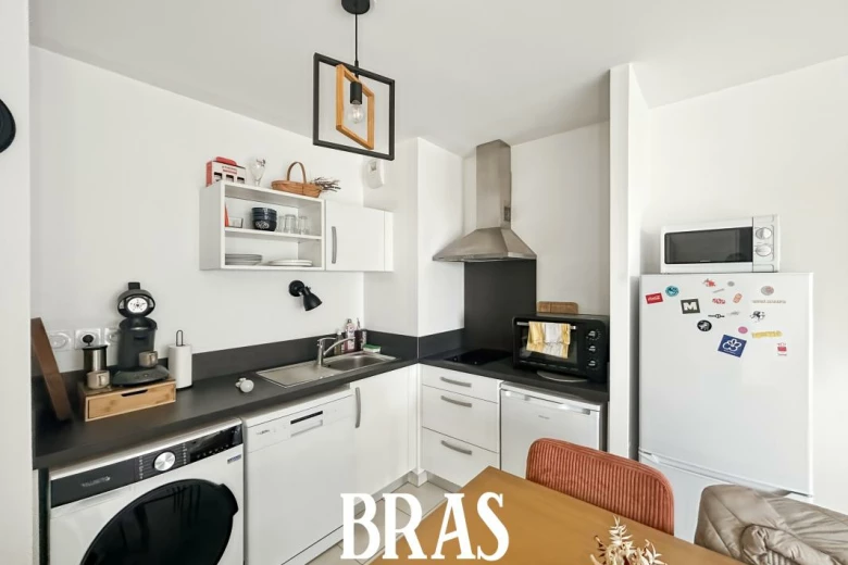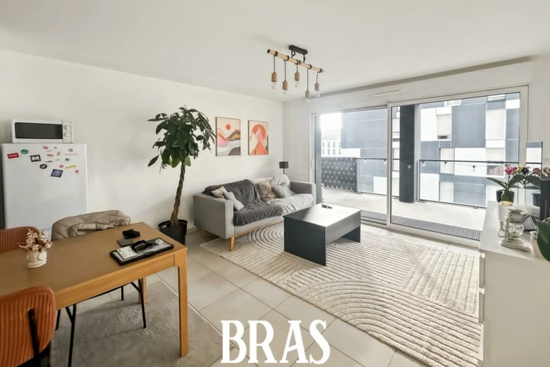 Appartement T2 de 40.80m² au 8ème étage avec ascenseur, une entrée avec placard, une pièce de vie donnant sur une terrasse, une cuisine aménagée et équipée (hotte, plaques de cuisson et four), une chambre, une salle d'eau avec une douche et un meuble vasque et wc.