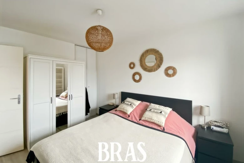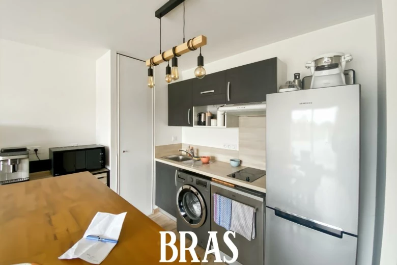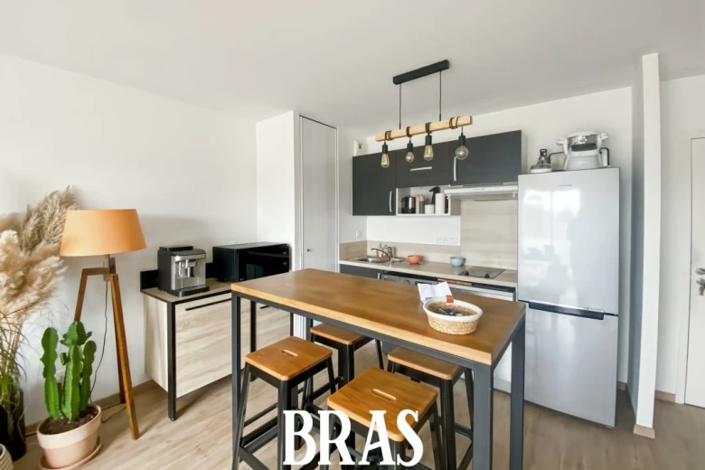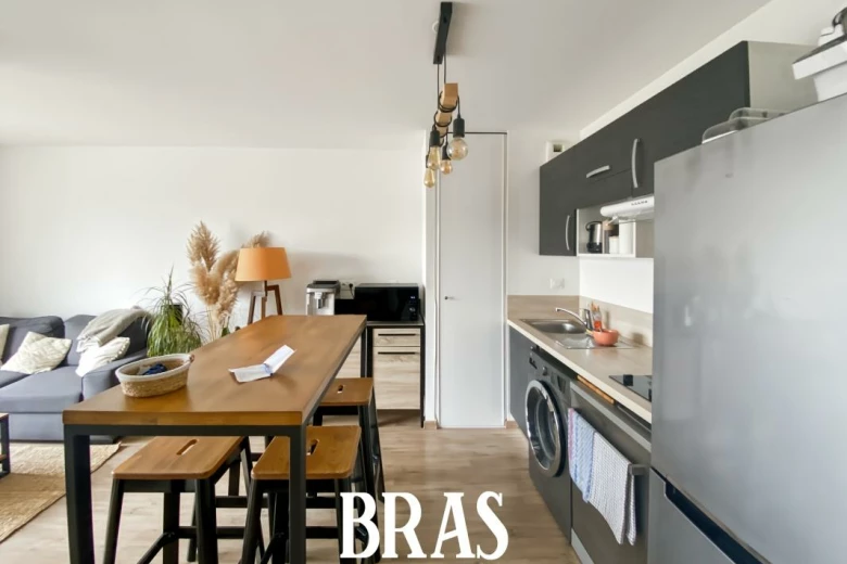 Dans une résidence calme de 2018, un appartement T2 de 42.73m² situé au 1er étage avec ascenseur et comprenant : une pièce de vie avec une cuisine aménagée et équipée (plaque de cuisson, hotte et réfrigérateur), un balcon d'environ 5m², une chambre et une salle d'eau avec douche, vasque sur meuble et WC. Une place de stationnement privative extérieure.