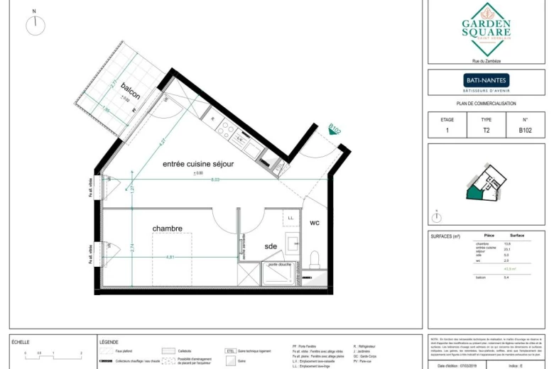 Allée de Bagatelle - Dans une résidence récente au pied du Parc de la Chézine, appartement de type 2 de 43,90m² situé au 1er étage avec ascenseur et comprenant : entrée avec placard, pièce de vie de 23,10m² avec cuisine aménagée et équipée (plaques de cuisson induction, hotte et réfrigérateur table top), donnant sur un balcon de 5,40m² exposé Nord-Ouest, une chambre de 13.80m², une salle d'eau avec douche et meuble vasque, WC séparés.