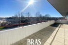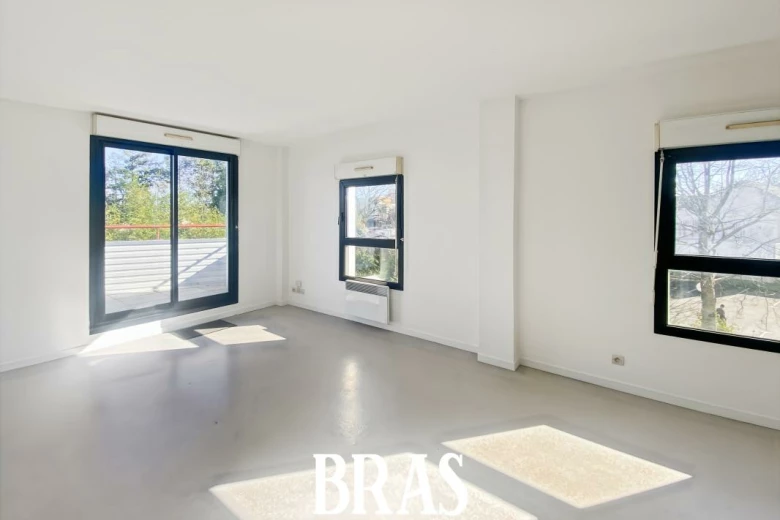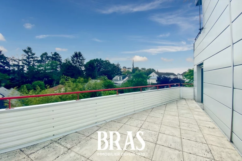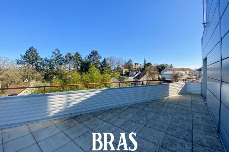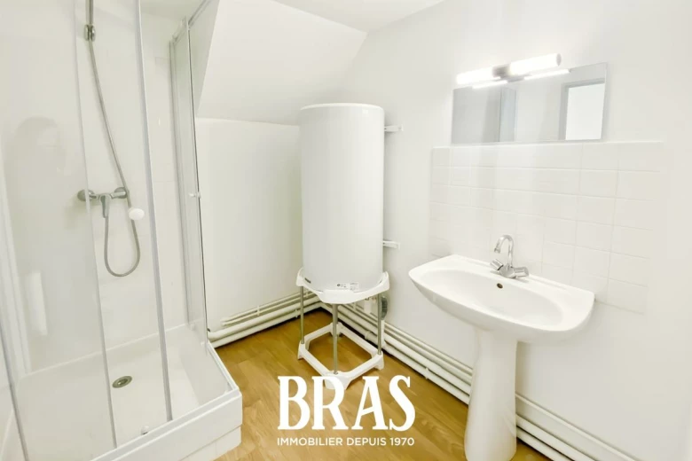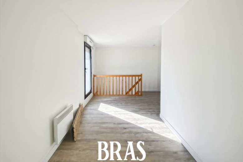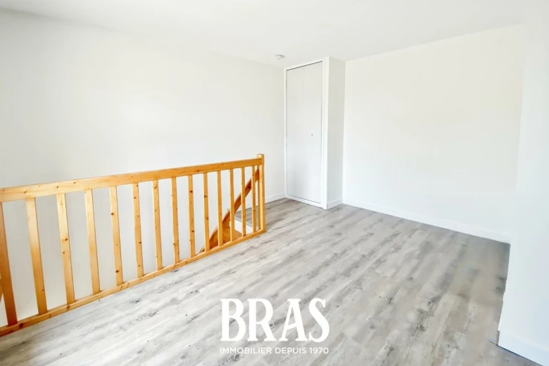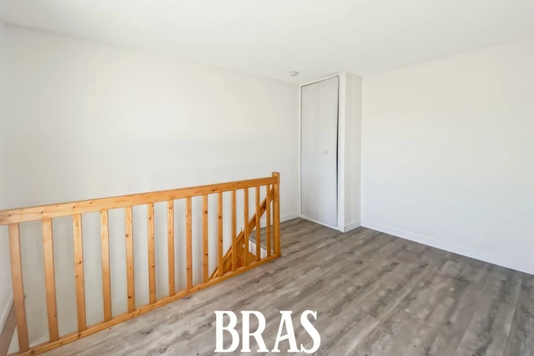 À l'étage : une grande chambre de 17,09m² avec placard, donnant sur une seconde terrasse partagée de 12m².
