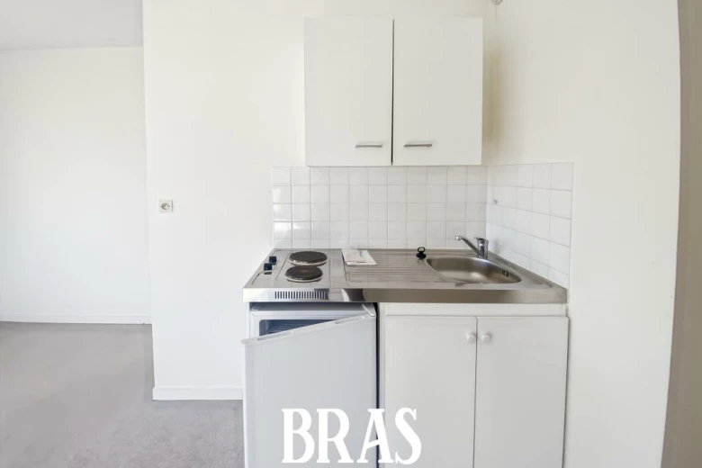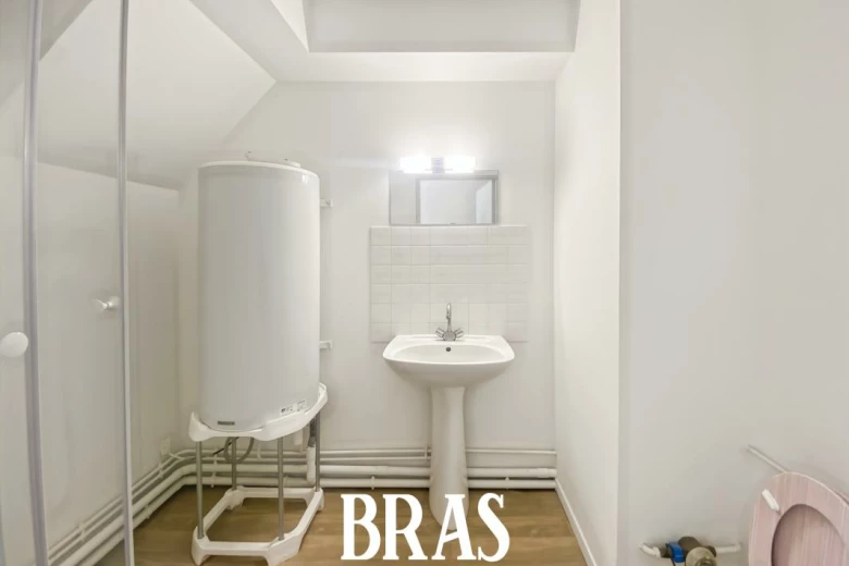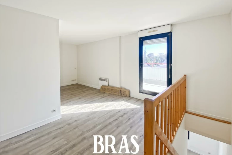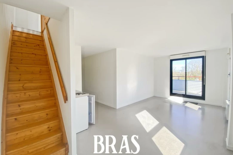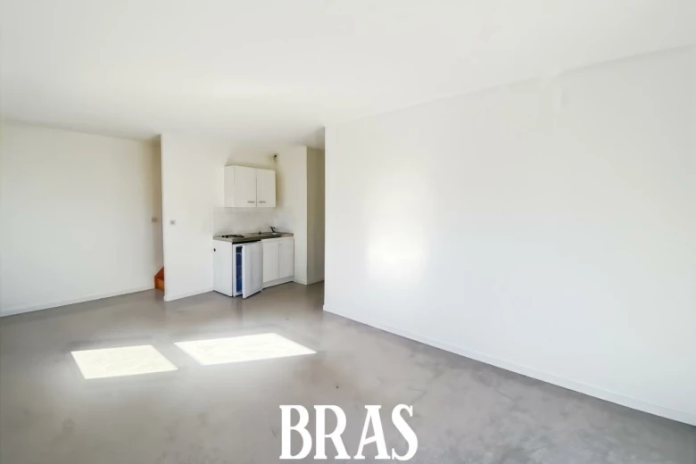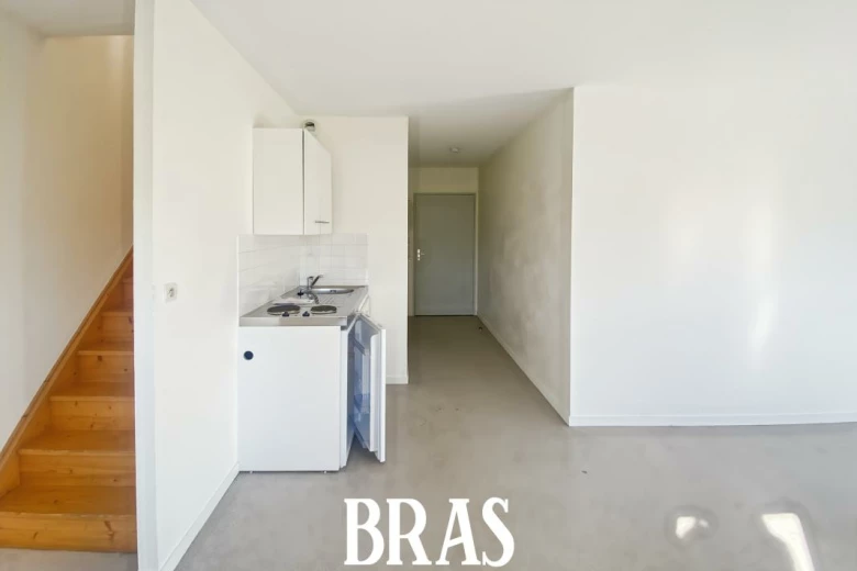 Un appartement de type 2 non meublé en duplex de 40,50m² situé au 3ème et dernier étage sans ascenseur et comprenant au 1er niveau : une entrée, un séjour de 20,90m² avec avec cuisine aménagée et équipée (plaques de cuisson électriques et réfrigérateur table-top), donnant sur une terrasse partagée de 20m², une salle d'eau avec douche, lavabo et WC.