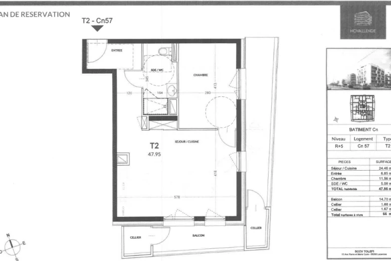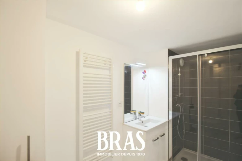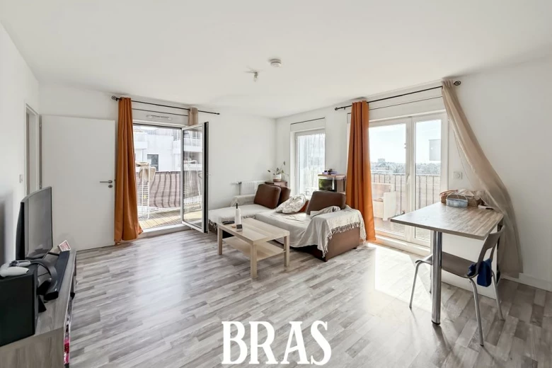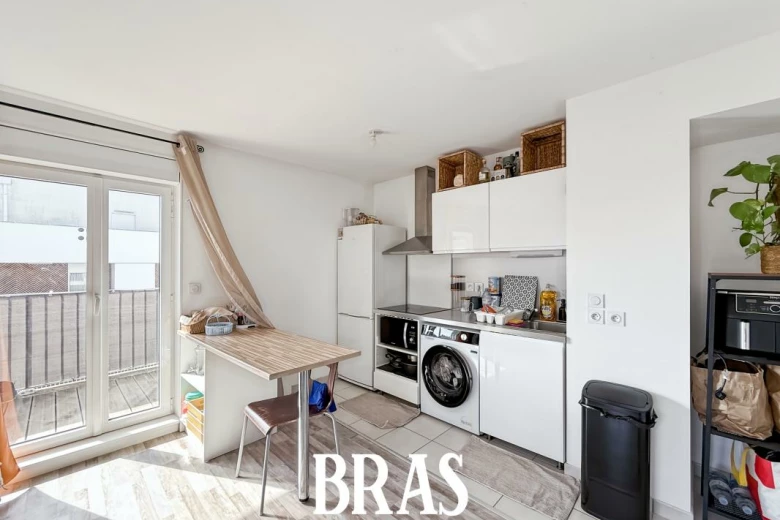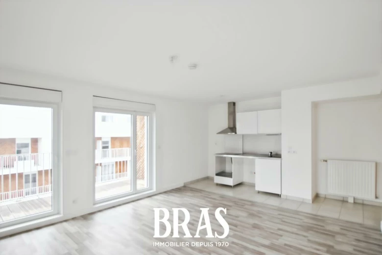 Rue Lucie Aubrac - Dans une résidence récente, à proximité immédiate du centre commercial Atlantis et au pied du tramway ligne 1, appartement de type 2 de 47,95m² situé au 5ème étage avec ascenseur et comprenant : une entrée, pièce de vie de 24,46m² avec cuisine aménagée et équipée (plaques de cuisson et hotte), donnant sur 2 balcons de exposé Sud-Est avec 2 celliers attenants, une chambre de 11,56m², une salle d'eau avec douche, meuble vasque et WC.