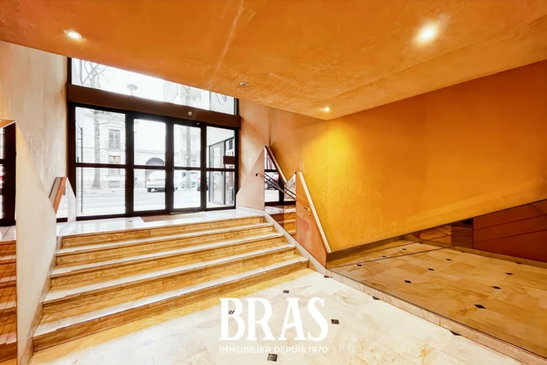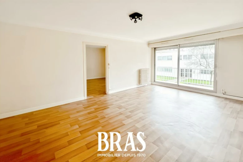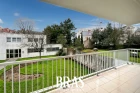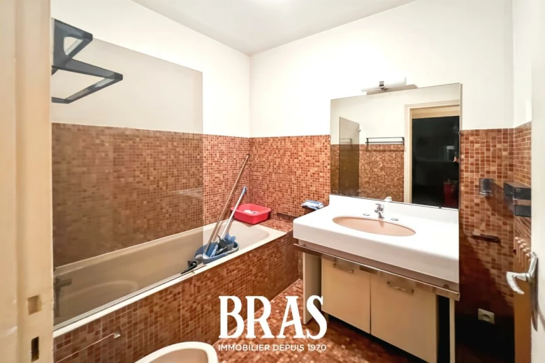 Dans une résidence sécurisée, agréable appartement de type 2 de 62.7m² situé au 1er étage avec ascenseur donnant côté jardin, comprenant : une entrée avec placard, dégagement, pièce de vie avec placard donnant sur un balcon, cuisine aménagée et équipée (plaques de cuisson, hotte et four), chambre avec placard, une salle de bains avec baignoire et meuble vasque, WC séparés.