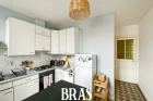 une entrée, une salle de bain avec baignoire, vasque et WC, une cuisine séparée, aménagée et équipée (four, plaque de cuisson gaz et hotte), deux chambres et un séjour avec cheminées décoratives.