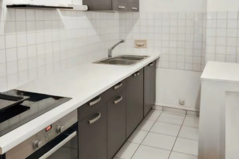 Appartement 3 pièces de 58 m² situé au 1er étage sans ascenseur, comprenant entrée avec placard, cuisine aménagée et équipée (plaque vitrocéramique et hotte) ouverte sur le salon, 2 chambres dont une avec placard, salle d'eau (avec douche et meuble vasque), WC séparés. Un balcon exposé sud. Un parking commun à la résidence.