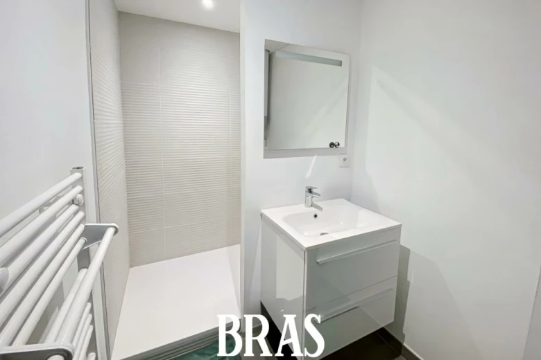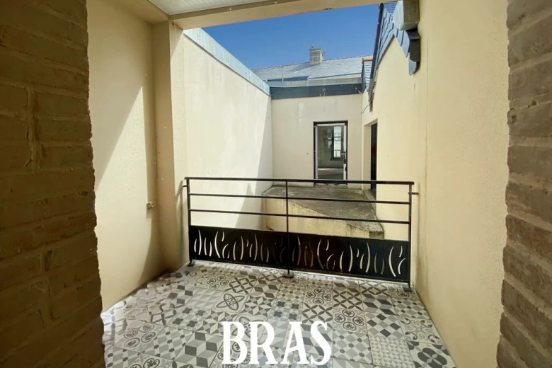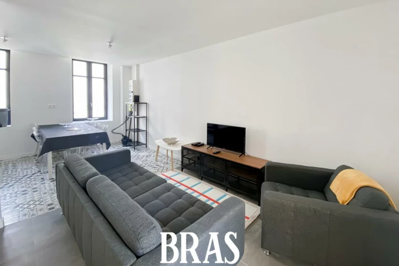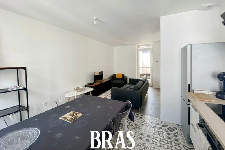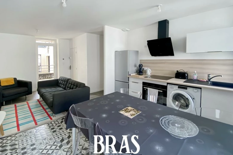 Coquet T3 meublé d'environ 44 m², situé au 1er étage avec cuisine aménagée et équipée (plaque, four, hotte, lave-linge, meubles hauts et bas) ouverte sur le séjour, dégagement, 2 chambres, salle d'eau avec balcon de 4.30 m².