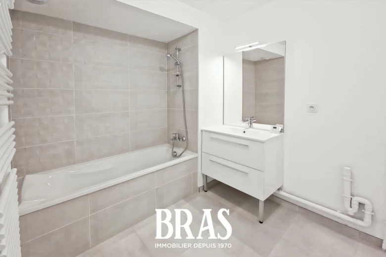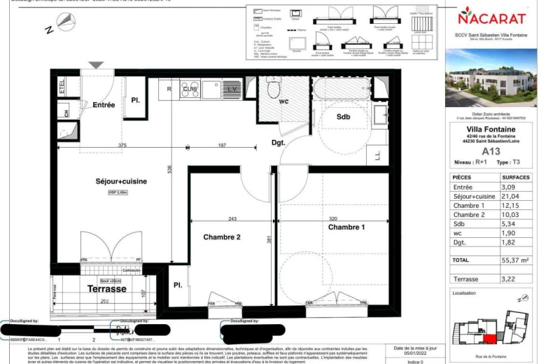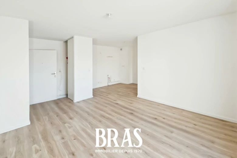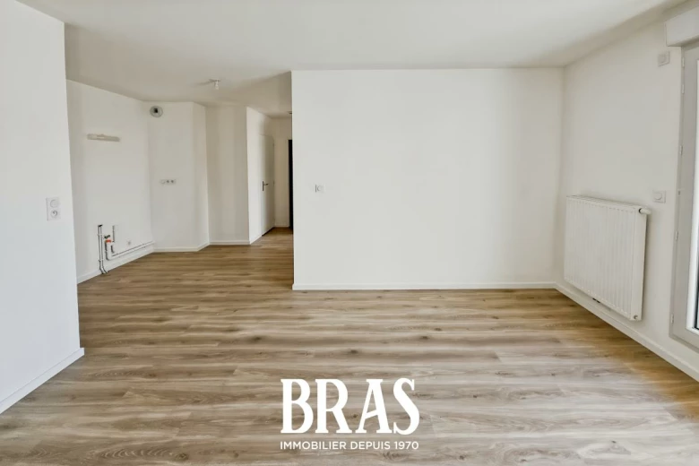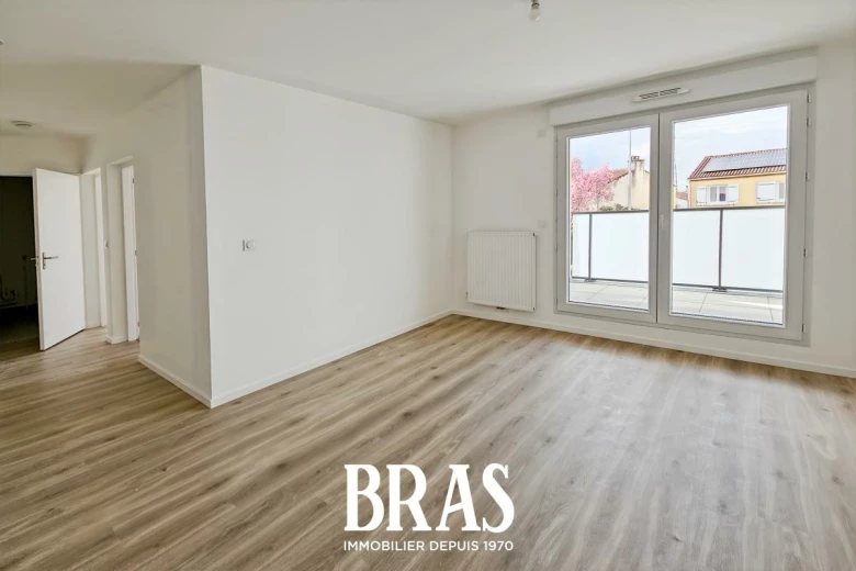 Un appartement récent de type 3 de 55.37 m² situé au 1er étage avec ascenseur. Comprenant entrée avec placard, séjour avec espace cuisine aménagé et équipé ( plaques de cuisson induction et hotte) et donnant sur une terrasse de 3.22 m², dégagement, 2 chambres dont 1 avec placard ( 12.15 m² et 10.03 m²), salle de bains et WC.