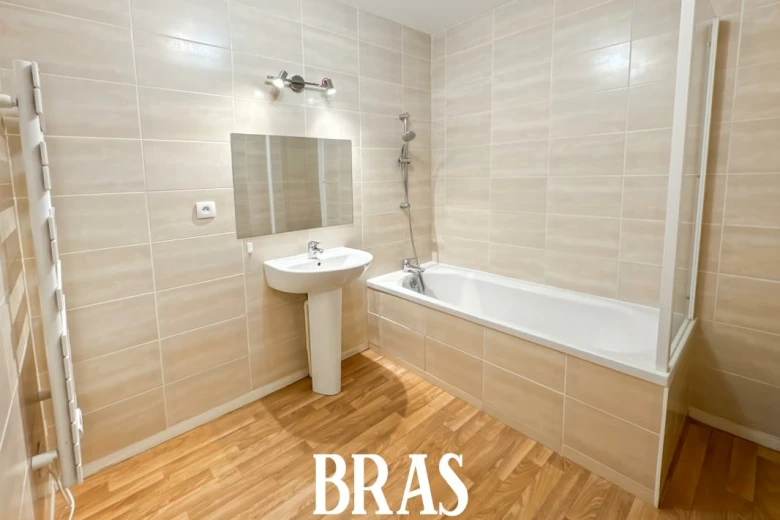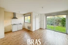 Salon / Séjour avec cuisine ouverte, 2 chambres, dégagement avec placards, salle de bains avec wc.