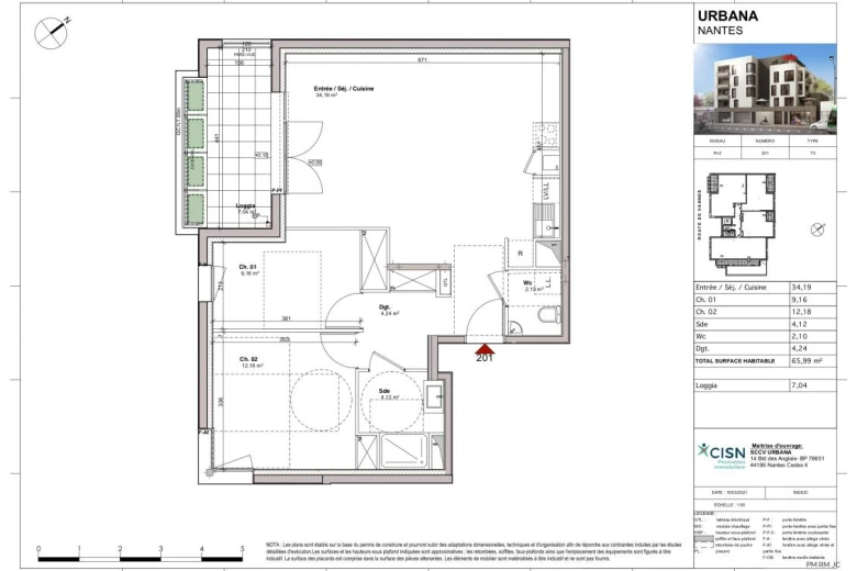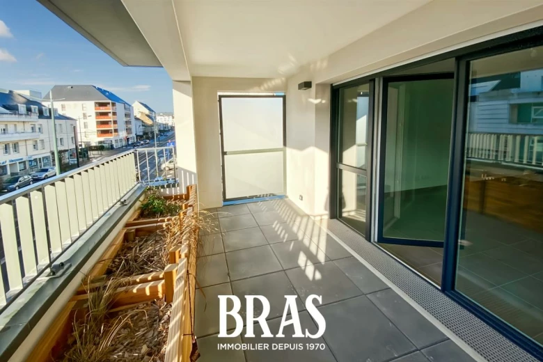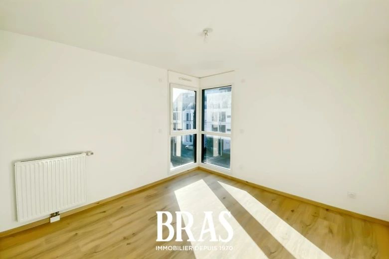 Route de Vannes - Dans une résidence de 2022, un appartement de type 3 de 65,54m² situé au 2ème étage avec ascenseur et comprenant : une entrée sur pièce de vie de 34,19m² avec cuisine aménagée et équipée (table de cuisson induction, hotte et four) donnant sur une loggia de 7,04m² avec jardinière exposée Sud-Ouest, 2 chambres de 12,18 m² et 9,16 m² dont une avec placard, une salle d'eau avec douche et meuble vasque, WC séparés.