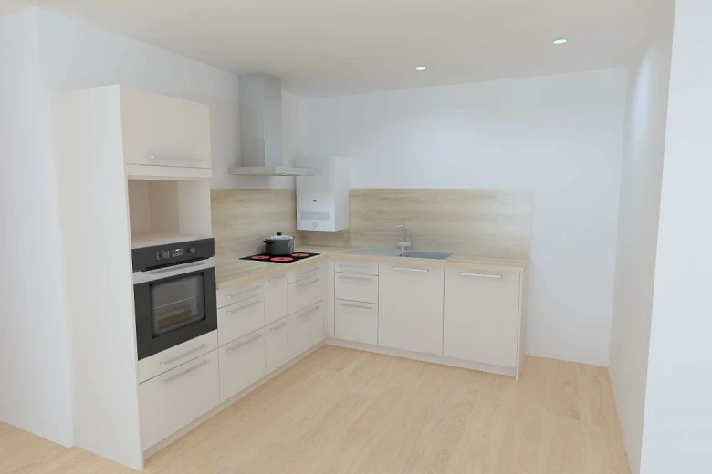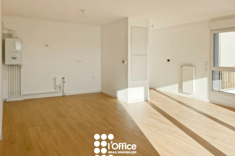 Il se compose d'une entrée avec placard, d'une vaste pièce de vie de 34,48 m² avec cuisine aménagée et équipée (plaque, four, hotte), de deux chambres dont une avec placard, d'une salle d'eau avec sèche-serviette et de WC séparés avec lave-mains.