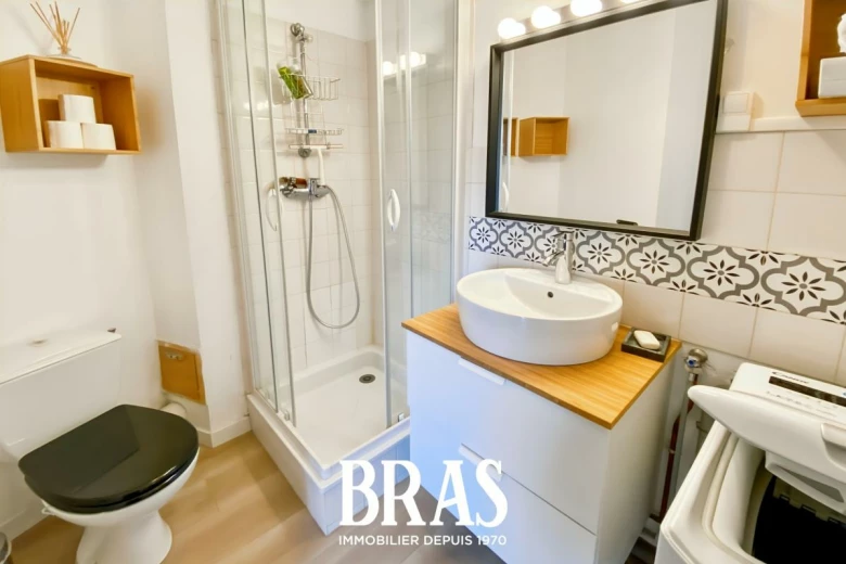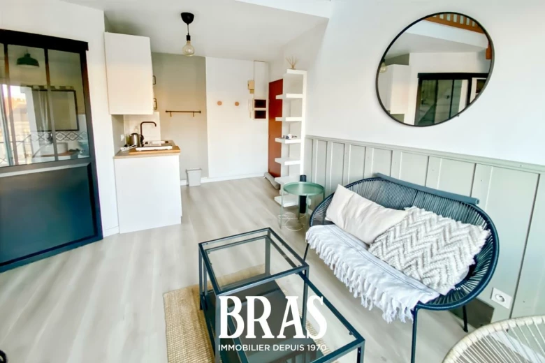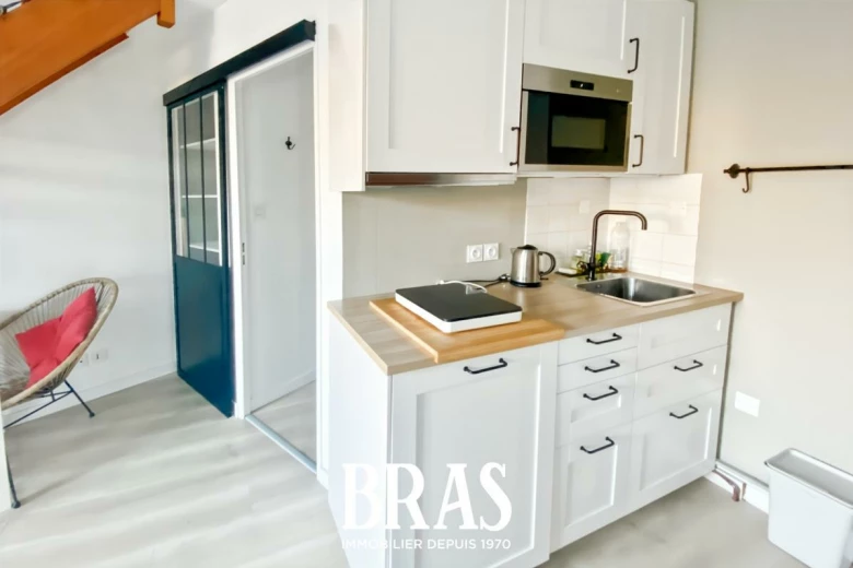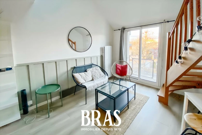 Dans une résidence calme et au pied du tramway ligne 2, un appartement de type 1 bis duplex MEUBLÉ de 27.64 m² situé au 2ème et dernier étage sans ascenseur et comprenant : pièce de vie avec cuisine aménagée et équipée (plaques de cuisson, four, réfrigérateur table top), une salle d'eau avec douche et WC. À l'étage/mezzanine : un espace nuit avec rangements.