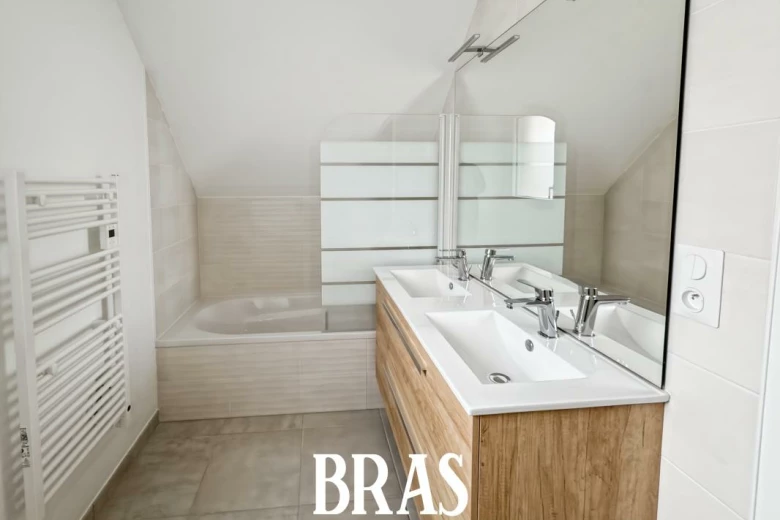 À l'étage: 2 belles chambres, un grand dressing, un dégagement, une salle de bains avec baignoire et meuble double vasque, WC séparés.