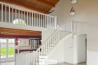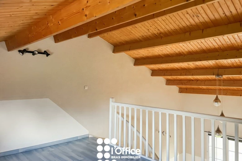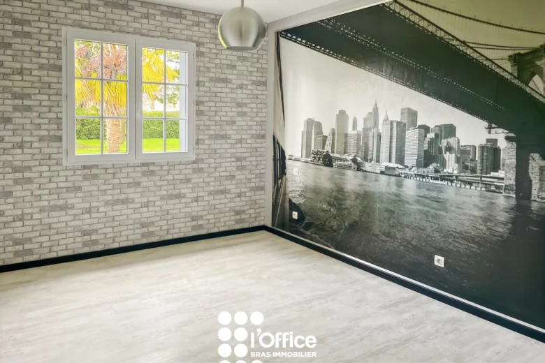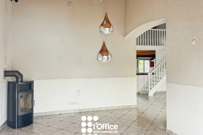 L'entrée s'ouvre sur une pièce de vie spacieuse et lumineuse avec sa cuisine aménagée et entièrement équipée, ouverte sur un vaste espace salon-séjour / salle à manger. Cet espace offre un accès direct à la terrasse et au grand jardin. Une très belle hauteur sous plafond complétée par une mezzanine parfaite pour un bureau ou un coin lecture.